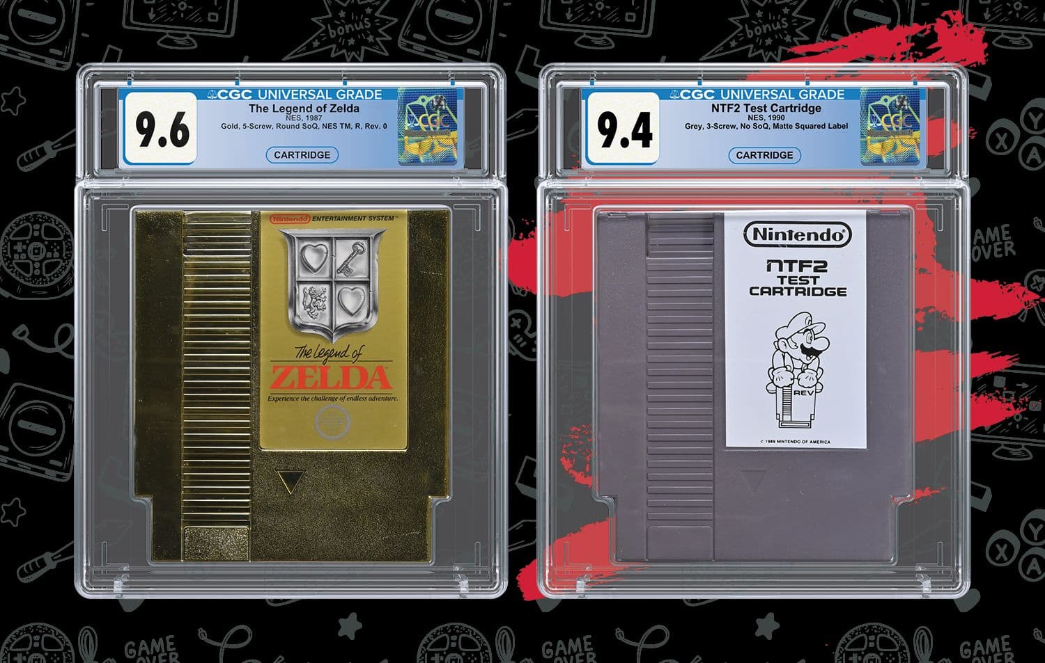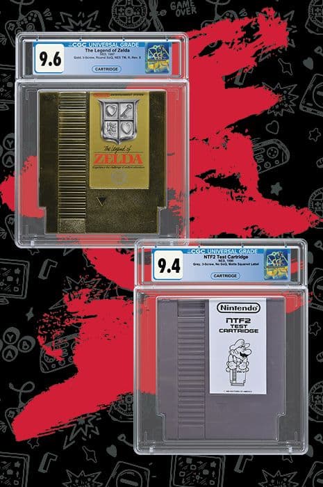 In addition to the golden five-screw cartridge, a rare NTF2 test cartridge is among the CGC-certified highlights.