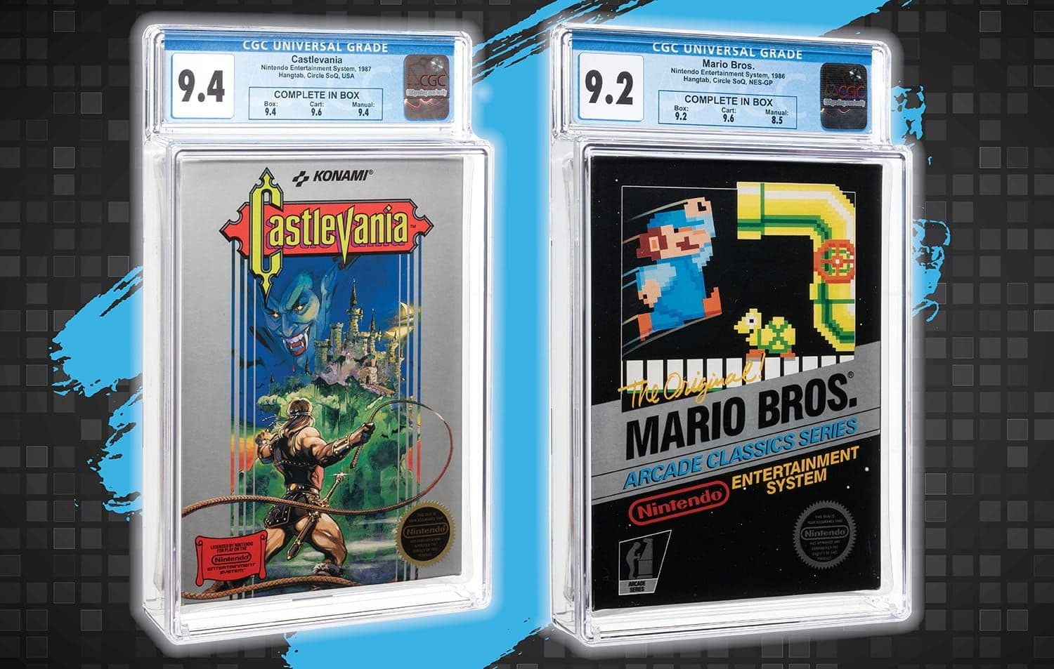 Also featured in the sale is a complete in box Mario Bros. for the Nintendo Entertainment System (1986) graded CGC 9.2 with CIB grades of 9.2 for Box, 9.6 for Cartridge and 8.5 for Manual (lot 79074). A NES port of the arcade game, Mario Bros. marked the first appearance of Luigi and featured two player co-op gameplay featuring both of the iconic Italian plumbers. Mario Bros. is significantly rarer than other titles in the Super Mario Bros. franchise for the NES, making it a staple for Nintendo collectors.