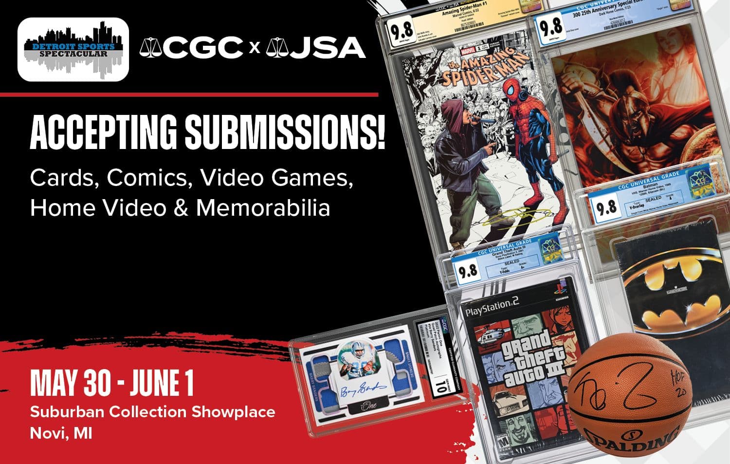 CGC® and JSA® are excited to be accepting submissions of sports cards, TCGs, non-sports cards, comics, magazines, video games, home video collectibles and memorabilia at the Detroit Sports Spectacular, being held at the Suburban Collection Showplace in Novi, Michigan, from May 30 to June 1, 2025.