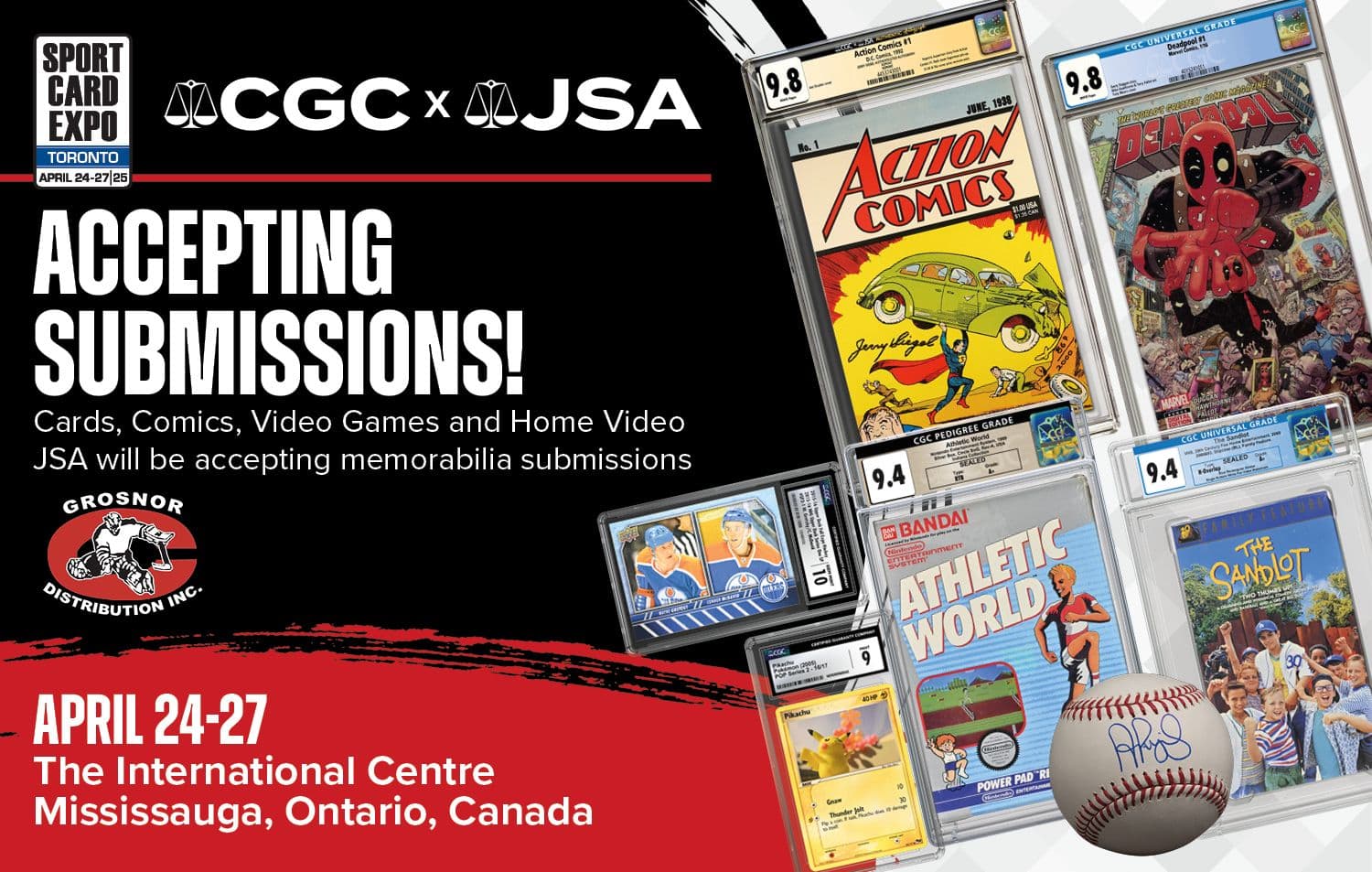 CGC® is excited to be accepting submissions of sports cards, TCGs, non-sports cards, comics, magazines, video games and home video collectibles through our Official Submission Center, Grosnor Distribution Inc., at Sport Card Expo, being held at The International Centre in Mississauga, Ontario, Canada, on April 24-27, 2025. In addition, JSA® representatives will be in attendance to accept autographed memorabilia submissions.