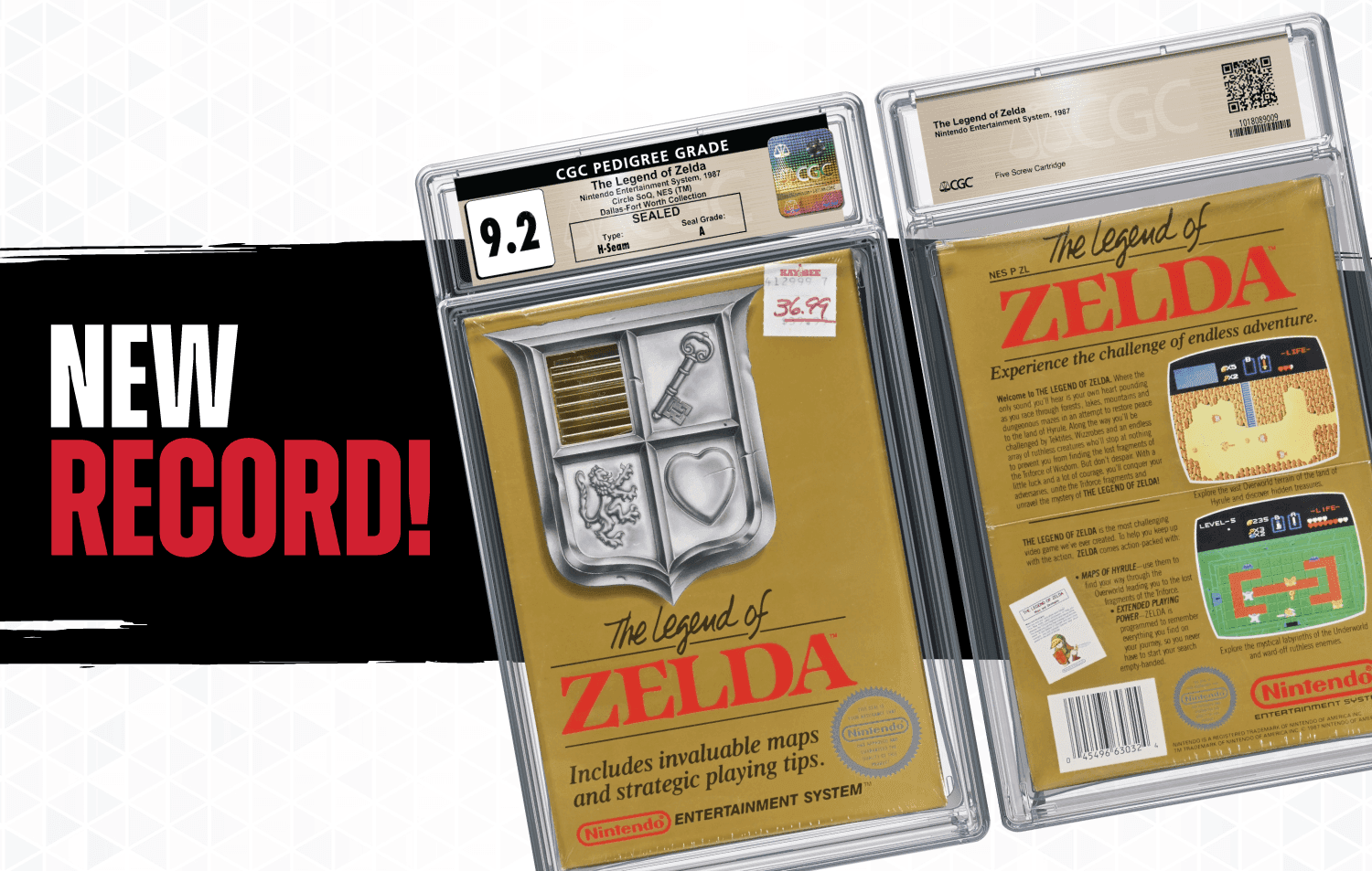The sealed copy of The Legend of Zelda for the Nintendo Entertainment System (1987) graded CGC 9.2 A and pedigreed to the Dallas-Fort Worth Collection (lot 28014) now holds the record for the highest-selling CGC-certified video game ever sold. Besides being a sealed first-production copy of the esteemed RPG, this copy of The Legend of Zelda is part of the esteemed Dallas-Fort Worth Collection — a group of more than 300 classic video games in excellent condition, with most still having the original price stickers from the stores they were purchased from. In addition, this is the highest graded first production copy of The Legend of Zelda ever offered in a public auction, according to Heritage Auctions.