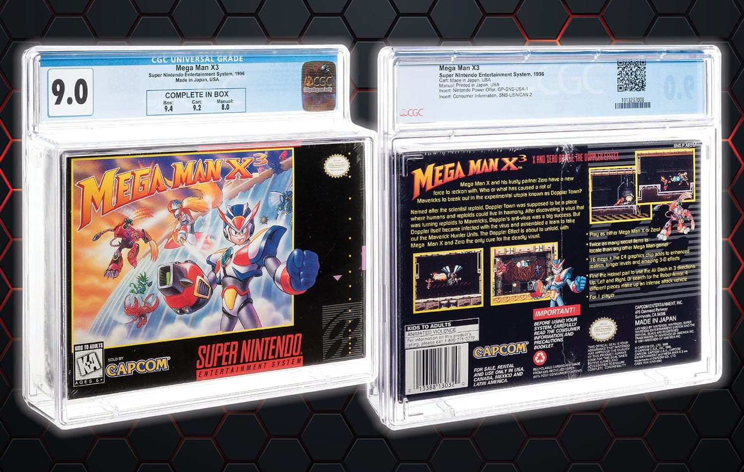 - a complete in box Mega Man X2 for the Super Nintendo Entertainment System (1995) graded CGC 9.0 with CIB grades of 9.4 for Box, 9.4 for Cartridge and 8.0 for Manual (lot 79128) that realized $2,400